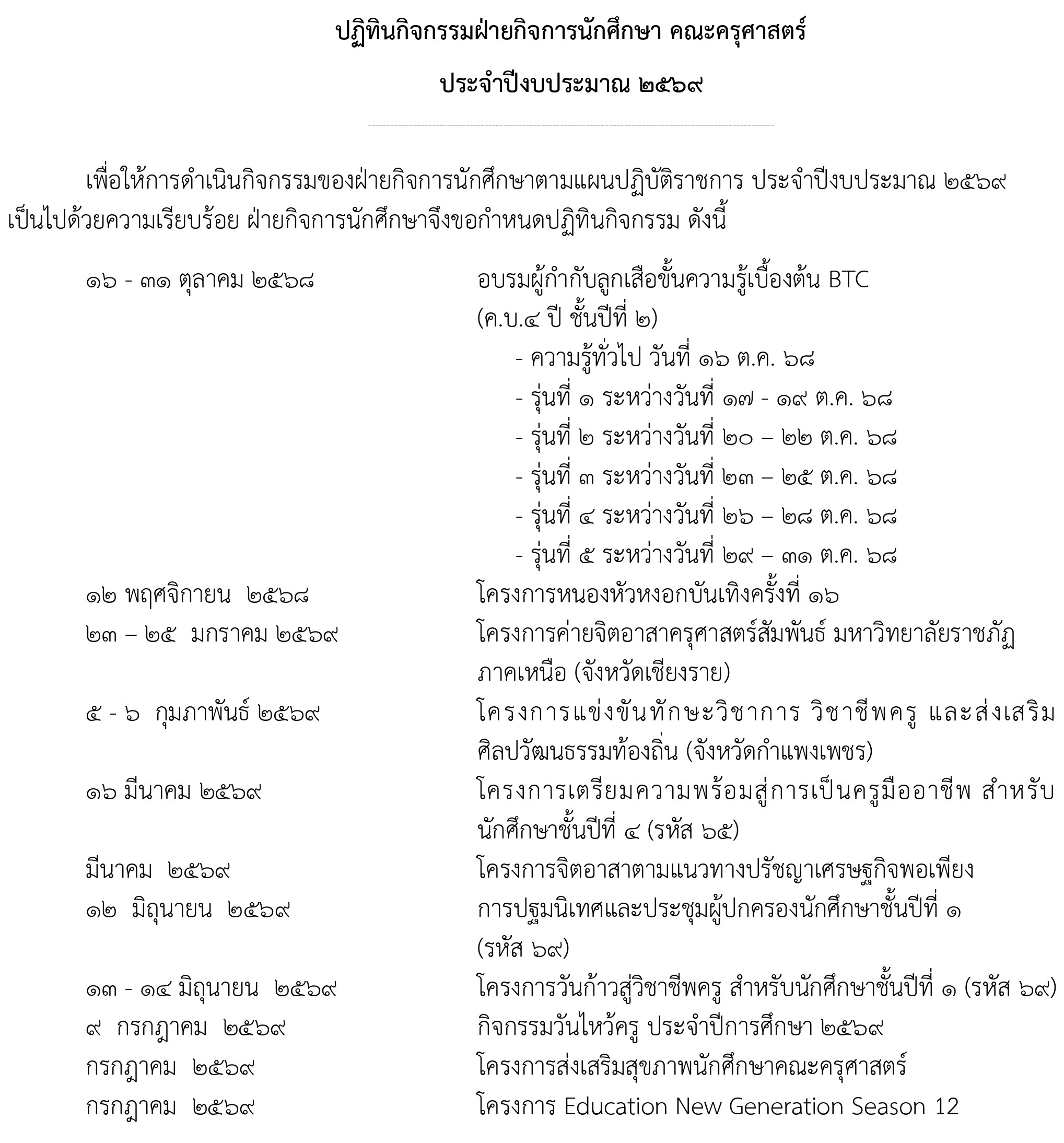 ปฏิทินกิจกรรมฝ่ายกิจการนักศึกษา